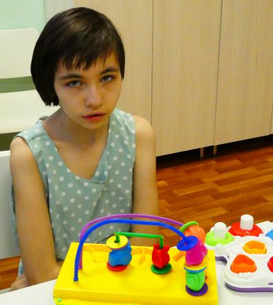 Анастасия - добрая, серьезная девочка. Легко идет на контакт со взрослыми и детьми. Дифференцирует свое имя. Обращенную речь понимает. Может выполнить некоторые элементарные одноступенчатые инструкции – «вставай», «садись», «иди», «ешь». Пищу принимает самостоятельно, одевается с помощью взрослого. Передвигается самостоятельно, под контролем взрослого.